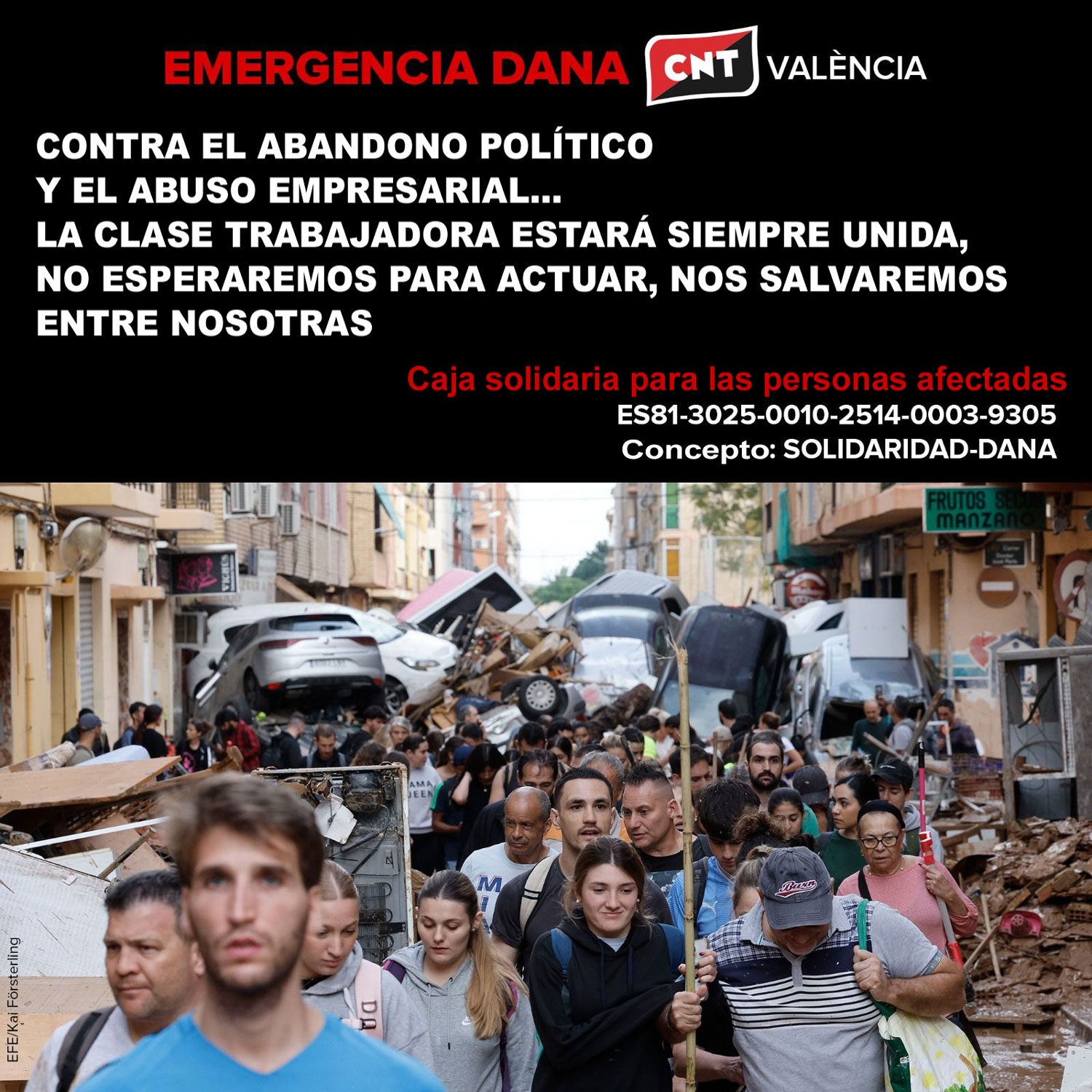 Frente al abandono político y contra el abuso empresarial la clase trabajadora estamos siempre unida, no esperamos para actuar y nos salvamos entre nosotras. Para hacer frente a los desastres generados por la DANA en València, CNT ha puesto en marcha una caja solidaria para ayudar a las personas afectadas. Os animamos a apoyarla en la medida de las posibilidades de cada una.