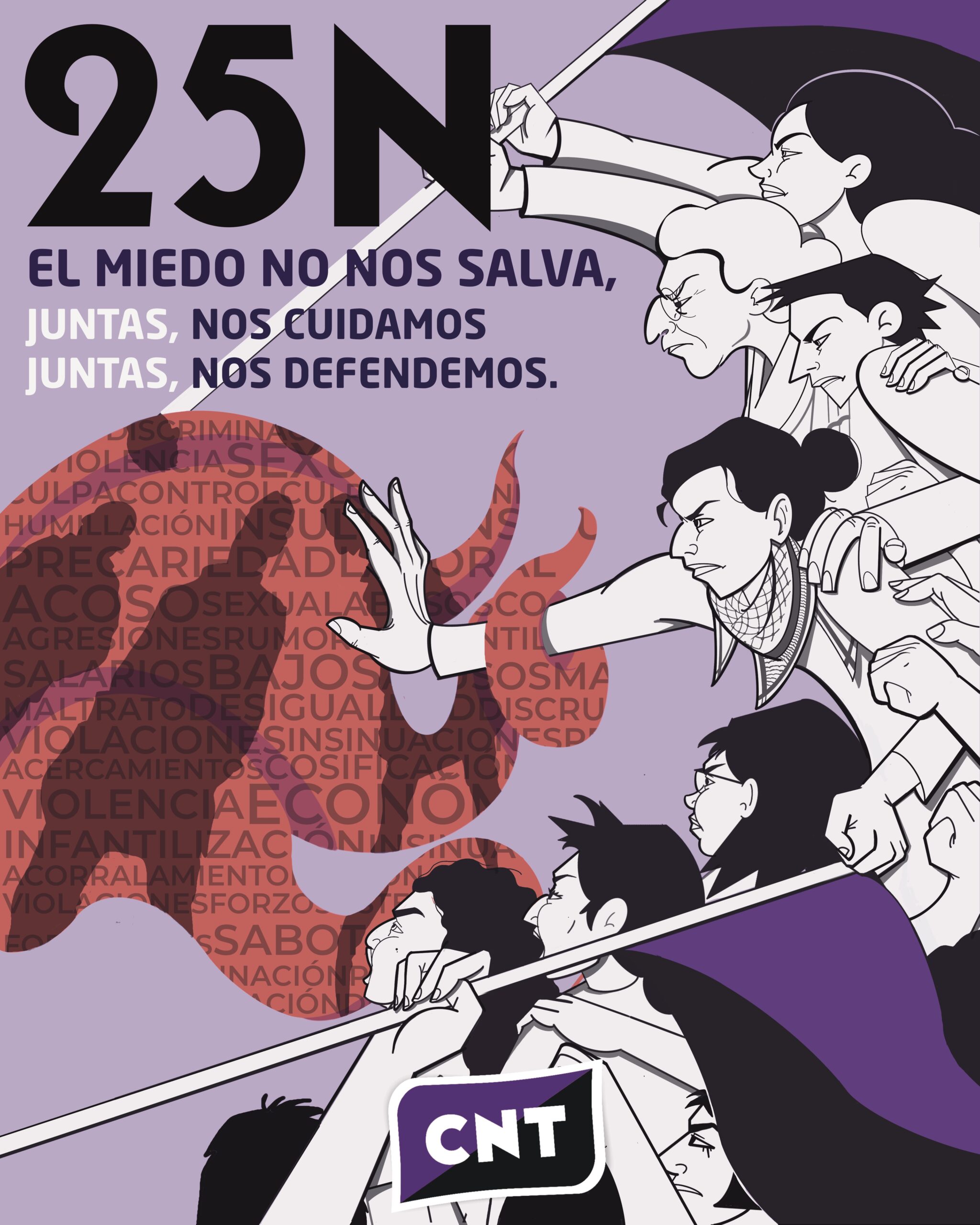 Por todo esto, este 25N decimos que sí, que, tenemos miedo, pero el miedo no nos salva. Nuestro miedo ha dado paso a la rabia y la alegría organizadas con nuestras compañeras en CNT. Nuestro miedo se ha tornado en motor de cambio, de reacción contra el patriarcado y el capital, que nos asfixian. En CNT sabemos que juntas nos defendemos ante los embistes de un mercado laboral despiadado y que juntas nos cuidamos de los agresores machistas fuera de nuestros espacios, y también dentro, porque somos mujeres que cuidamos de mujeres. En CNT soñamos y construimos mundos sin violencias machistas y es que, de tanto miedo, ya casi nada nos asusta.