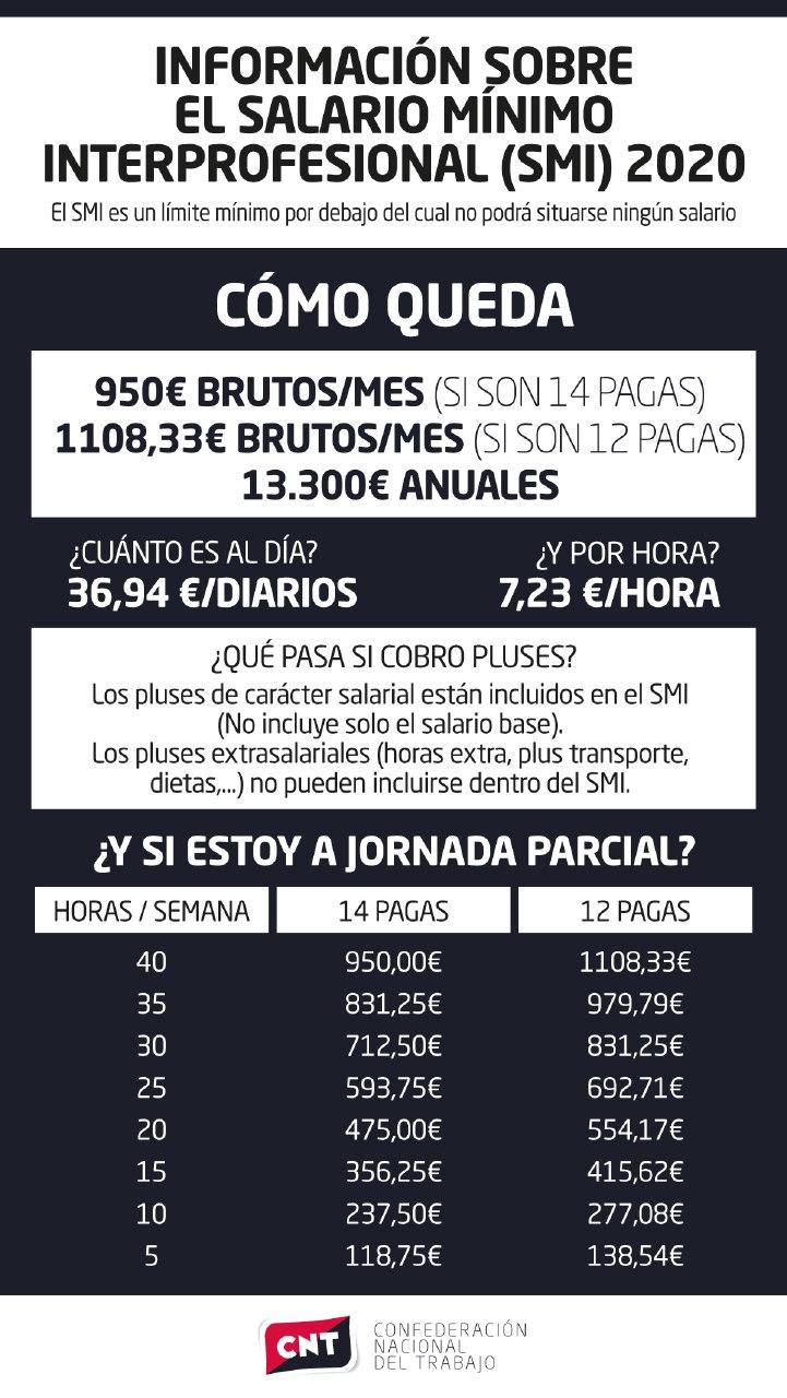 El SMI ha subido a 950 euros brutos, tal como se anunció a finales de enero. Por ello, desde el sindicato se ha realizado un esquema para que los trabajadores y trabajadoras afectadas tengan más claro cual es su nueva situación. Ante cualqueir duda, pásate por el sindicato.