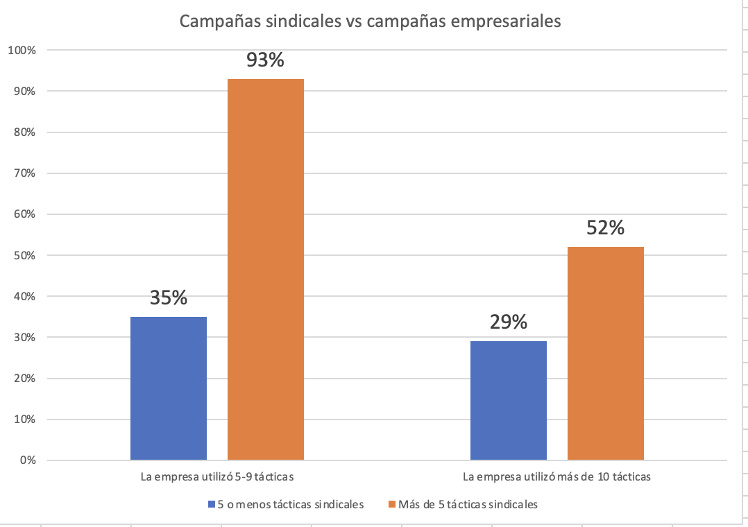 Bien, tanto el sindicato como el empresario despliegan sus tácticas en la campaña. La pregunta realmente interesante es: ¿hasta qué punto puede una buena campaña sindical derrotar a una dura campaña patronal? El estudio desglosa las cifras: