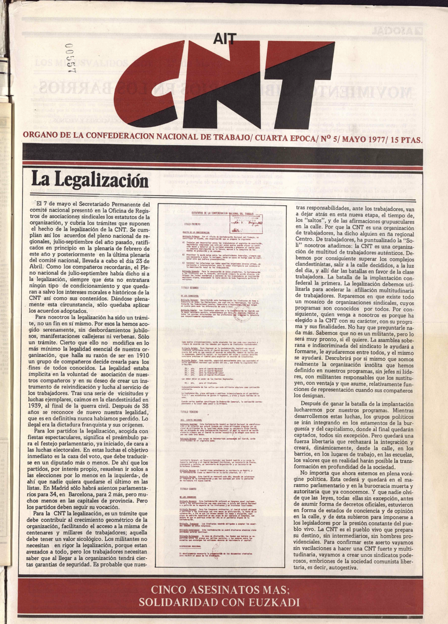 El 7 de mayo de 1977, los históricos Juan Gómez Casas y Pedro Barrio presentaban los estatutos de la CNT, que eran aprobados unos pocos días después. Con ello el anarcosindicalismo volvía a la legalidad tras 38 años de persecución y clandestinidad provocada por la imposición de la dictadura franquista.
