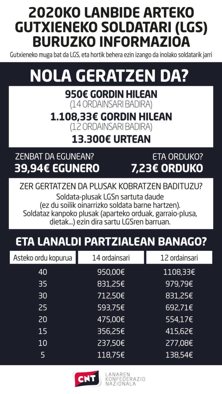 - LGS 2020 edo Lanbide arteko Gutxieneko Soldata 2020ko urtarrilaren 30ean adostu zen, ofizialki, hilean 950 -tan, soilik Errege Dekretua argitaratzea falta da