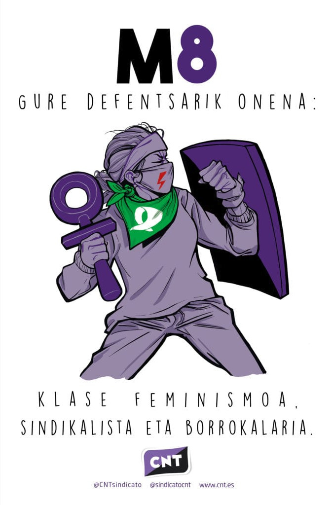 Pertsonak babesteko eta zaintzak balioesteko premia nabarmena ikusita, Lanaren Konfederazio Nazionalak, Martxoaren 8 honetan, klase feminismoa aldarrikatzen du, sindikalista eta borrokalaria, gure defentsarik onena bezala. Bizitza errotik eraldatuko duen feminismoa, bizitza zaintzak eta bizitzaa erdigunean jartzera bideratutako gizartea lortzeko gakoetan sakonduko duena. Sindikatuan gure bizitzak berreskuratzeko, babesteko eta duintzeko tresna eraginkorra aurkituko duen feminismoa. Bizitza eta lana uztartzeko, GURE denbora librea eta gauza garrantzitsuenak lehenesteko.