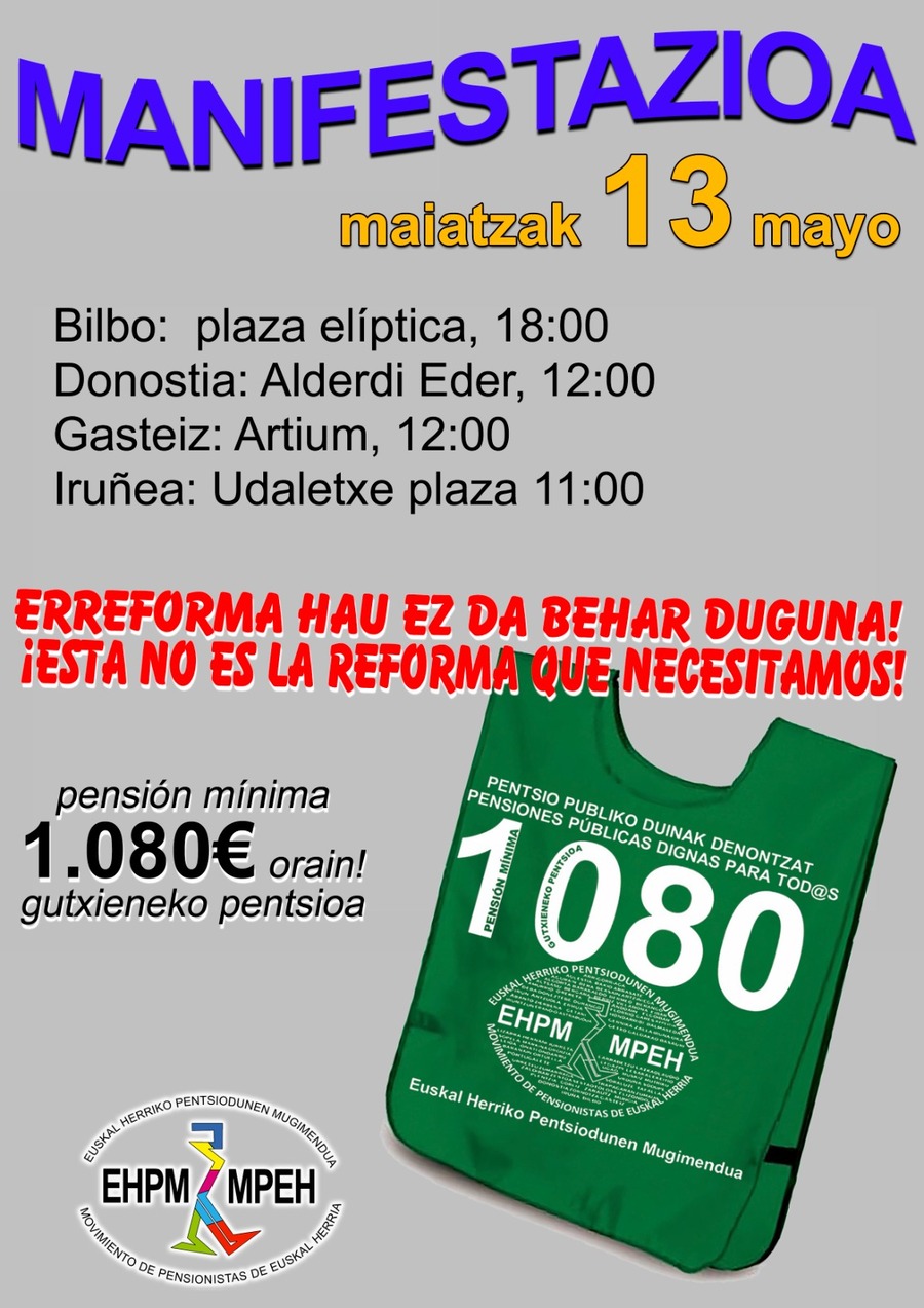 - Euskal Herriko Pentsiodunen Mugimenduak maiatzaren 13rako deitutako manifestazioetan parte hartzeko deia egin du
