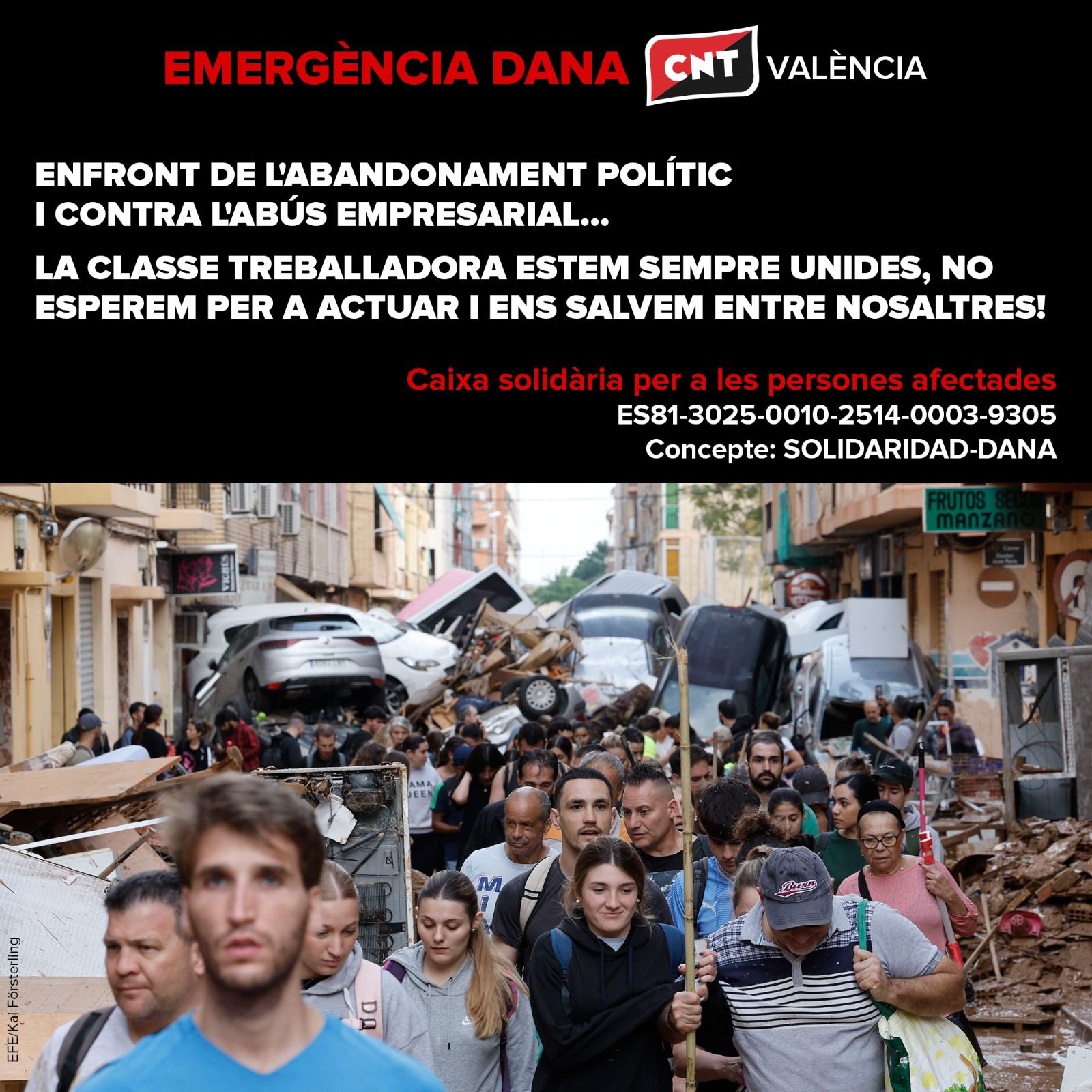 Utzikeria politikoaren eta enpresa-abusuaren aurka… langileria beti elkartuta gaude, ez dugu ekiteko itxaroten eta gure artean salbatzen gara. DANAk Valentzian sortutako hondamendiei aurre egiteko, CNTk kutxa solidario bat jarri du martxan kaltetutako pertsonei laguntzeko. Bakoitzak ahal duen neurrian laguntza ematera animatzen zaituztegu.
