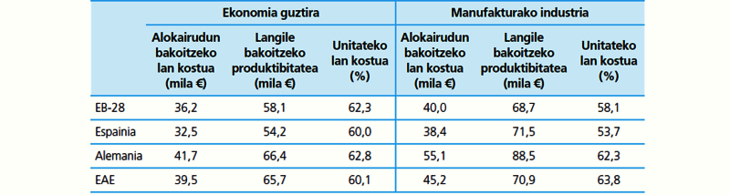 Txostenak beste elementu bat mahaiaren gainean jartzen du: Herrialdeak alderatuz badirudi manufakturazko industrian EAEren manufakturako industriaren unitateko lan kostuen egoera okerragoa dela, taulan adierazten den bezala; baina antzekoak diren eskualdeen aurrean, unitate lan kostu txikiagoa du. Hortik ondoriozta dezakegu sektore multzo honen egoera ez dela hainbatek dioten moduan, erabat txarra.